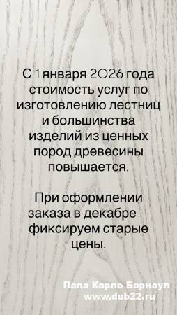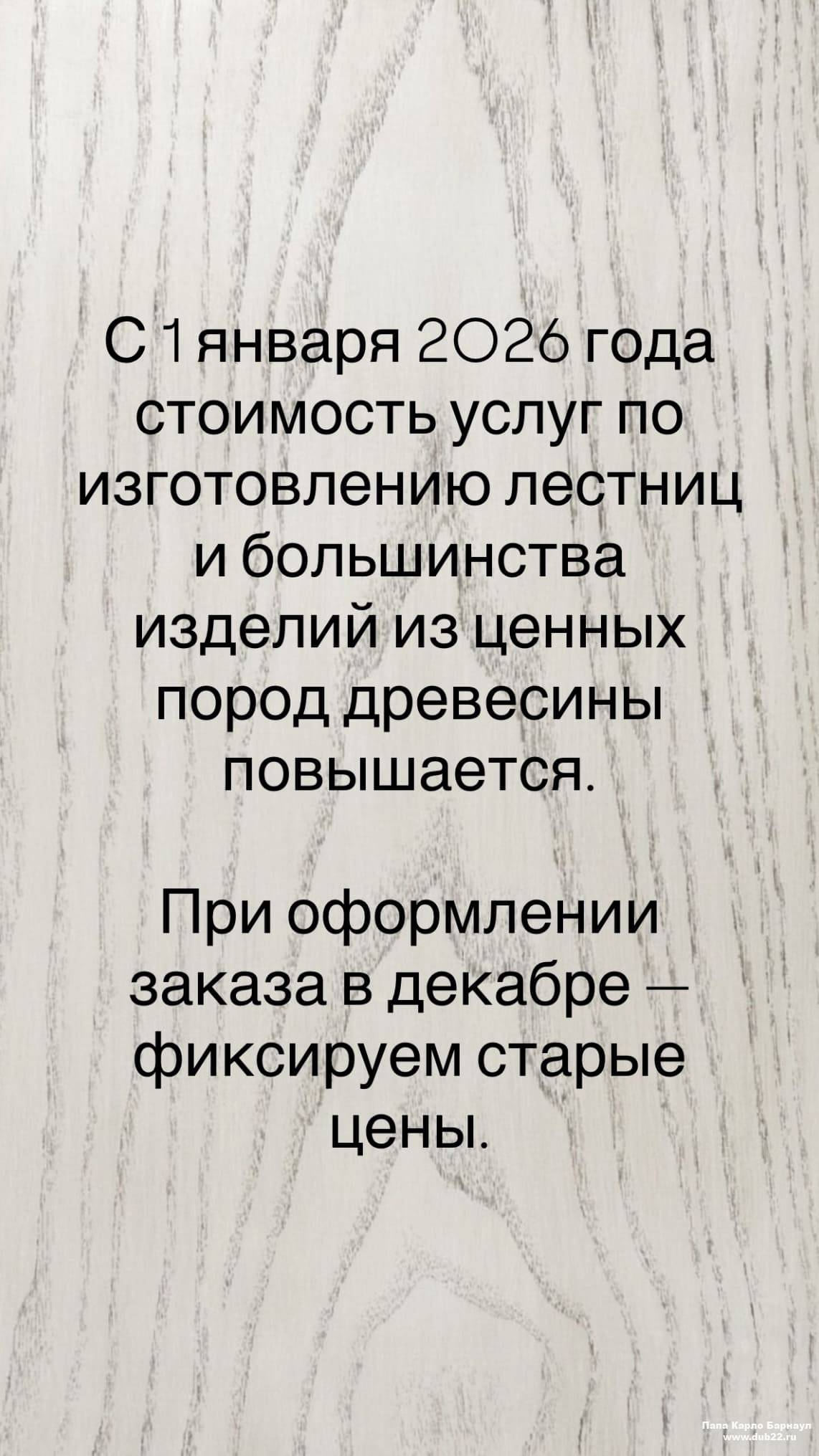 С 1 января 2026 года стоимость услуг по изготовлению лестниц и большинства изделий из ценных пород древесины повышается. При оформлении заказа в декабре - фиксируем старые цены.